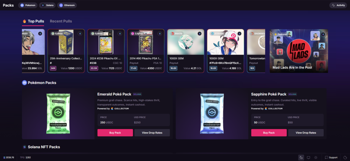 You’ll find a growing Pokémon card NFT lineup here, sorted primarily into Pokémon Packs on the Solana blockchain. Just connect your wallet, head to the packs page, and complete the purchase with just a few steps. Once you rip open a pack, you can trade its content right away, hold onto it, or redeem it for the physical version.